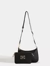 Está confeccionada en material alternativo al cuero y tiene apertura con cierre, bolsillo externo y correa regulable bordada con logo de la marca.