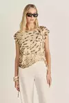Top confeccionado en género de punto con transparencia y diseño de estampa exclusiva de la colección Verano 26, en combinación con género de punto por debajo. En los laterales lleva frunces ajustables a gusto.