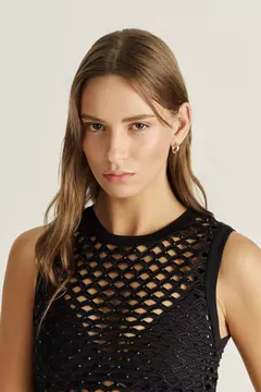 Este top tejido en crochet con detalles de strass es la pieza clave para elevar cualquier look de noche. Perfecto para quienes buscan estilo y sofisticación en una sola prenda.